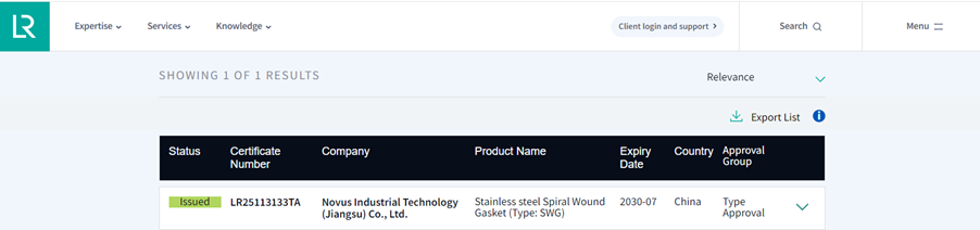 近期,我司金属缠绕垫片(Spiral Wound Gasket)产品顺利取得由英国劳氏船级社(LR,全称Lloyd’s Register)批准颁发的型式认可证书,证书有效期为:11/07/2025~10/07/2030。
